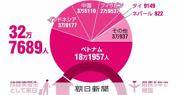 日本に滞在する技能実習生は、昨年6月現在で32万7689人。国別ではベトナム(18万1957人)、インドネシア(3万9177人)、中国(3万6110人)――の順だ。