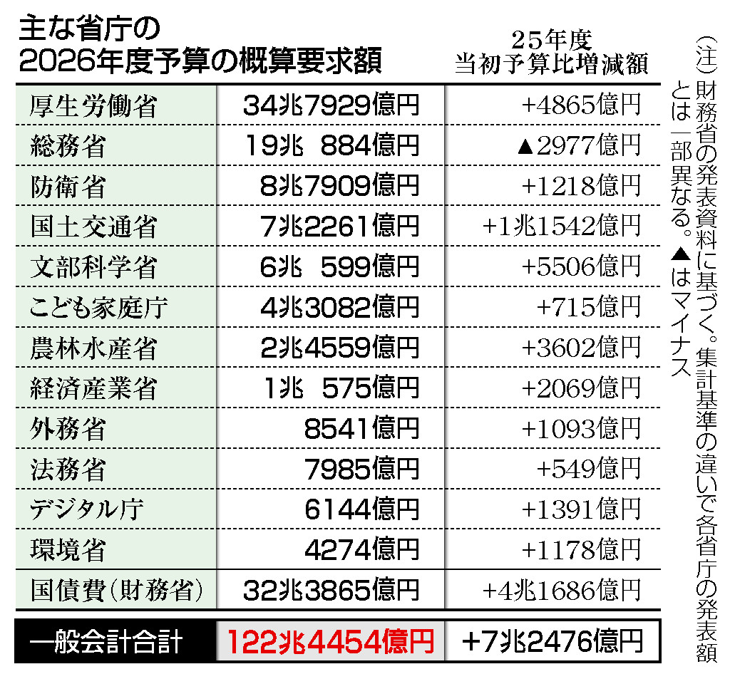 財務省は3日、2026年度一般会計予算の概算要求額が過去最大の122兆4454億円だったと発表した。